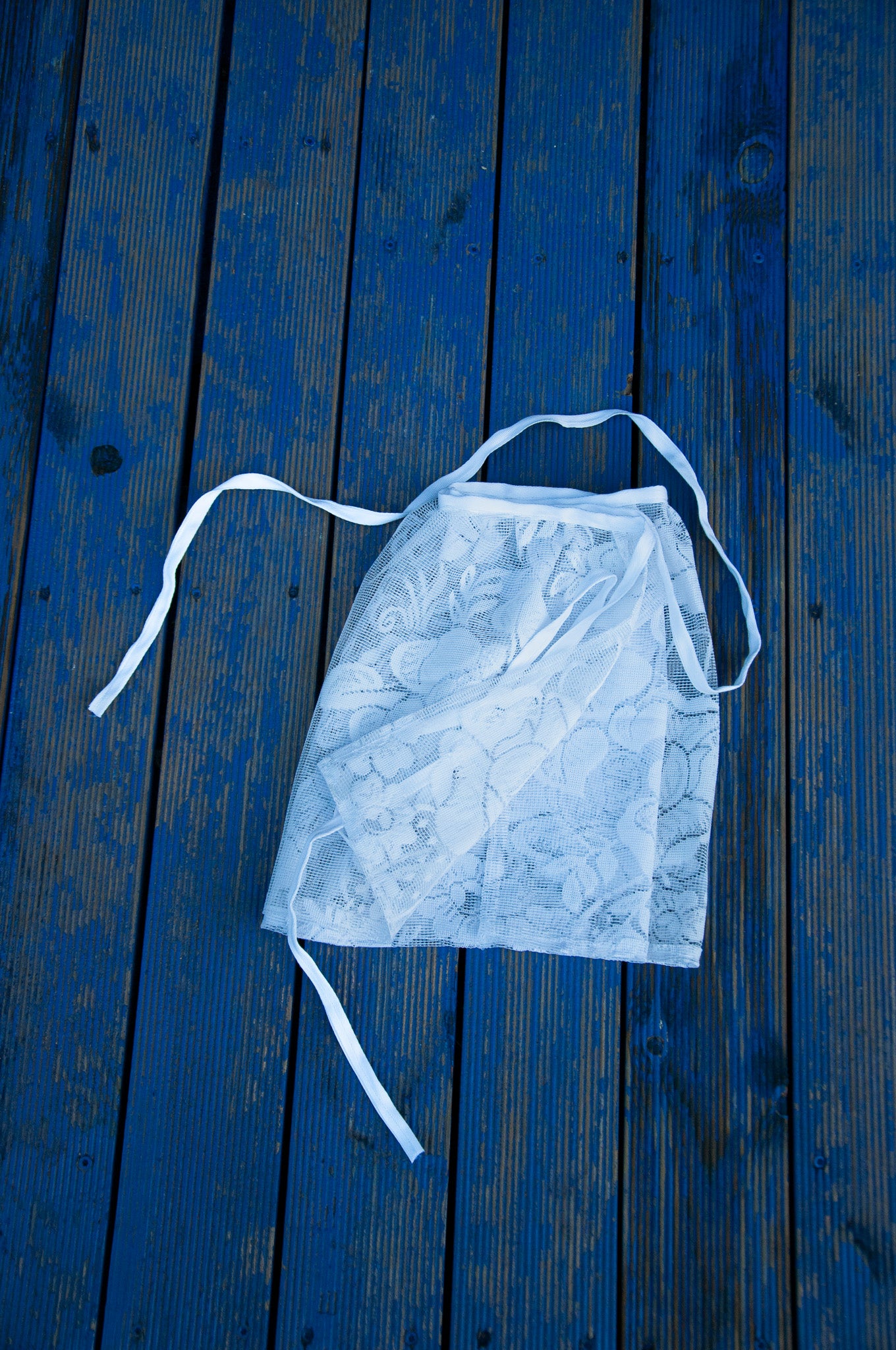 Słodki fartuszek z firanki z kwiatowymi wzorami.