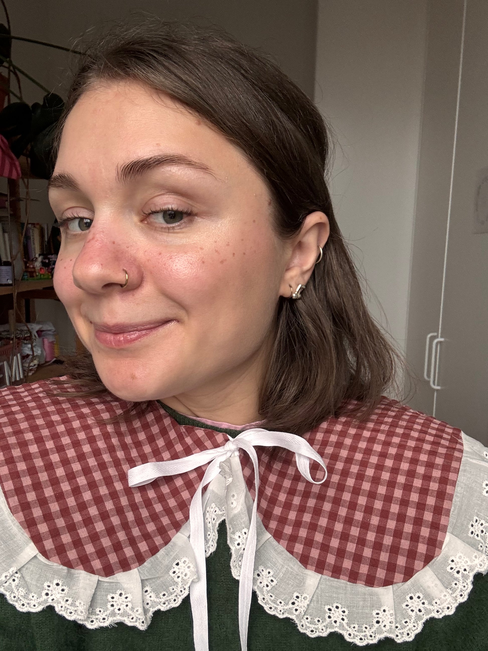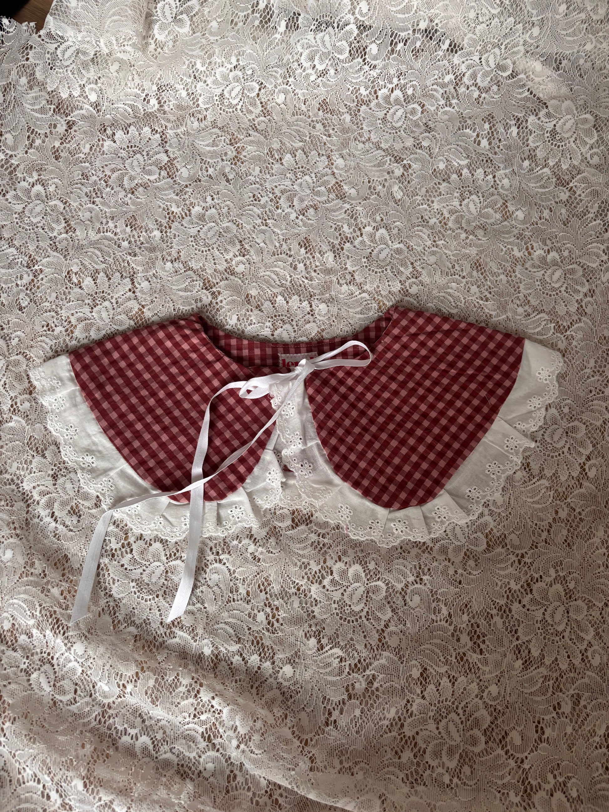 Kołnierzyk powstał z nowego materiału o certyfikatem z certyfikatem OEKO-TEX bawełny obszyty jest batystem bawełnianym z haftem angielskim.