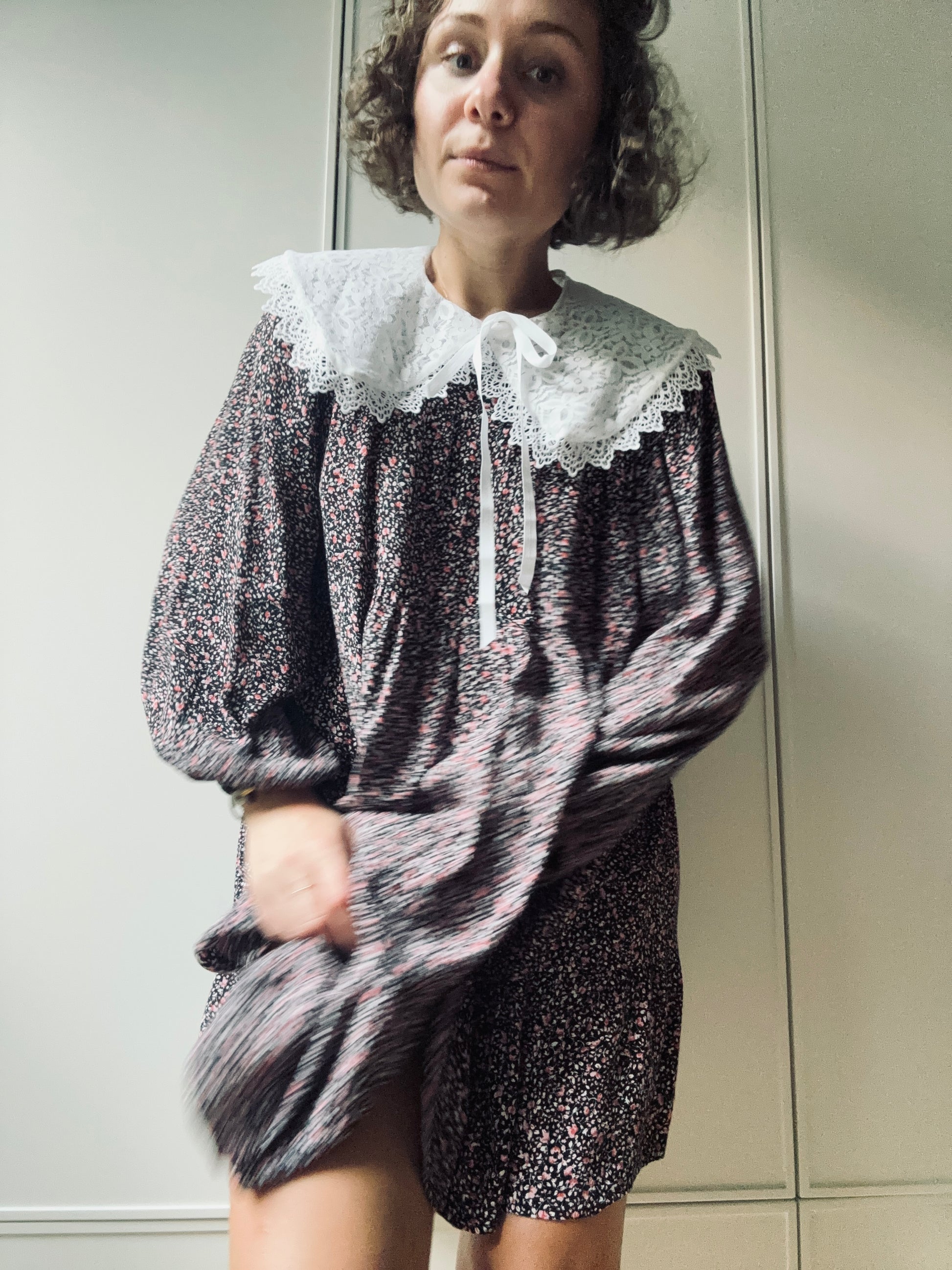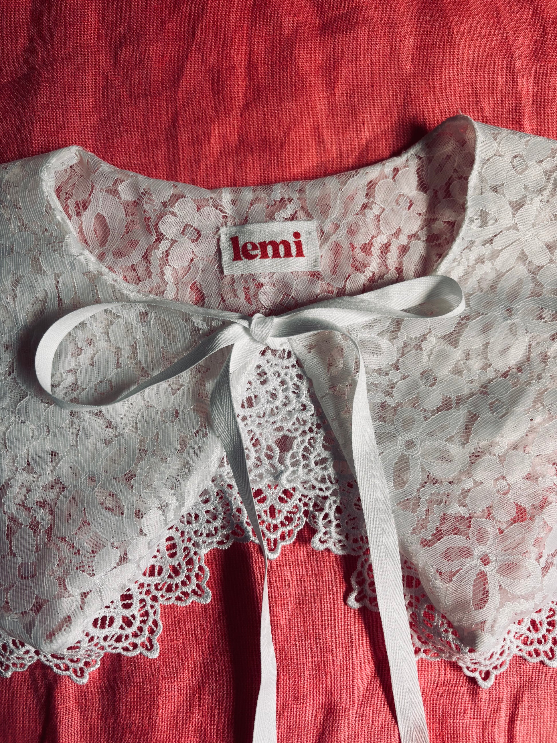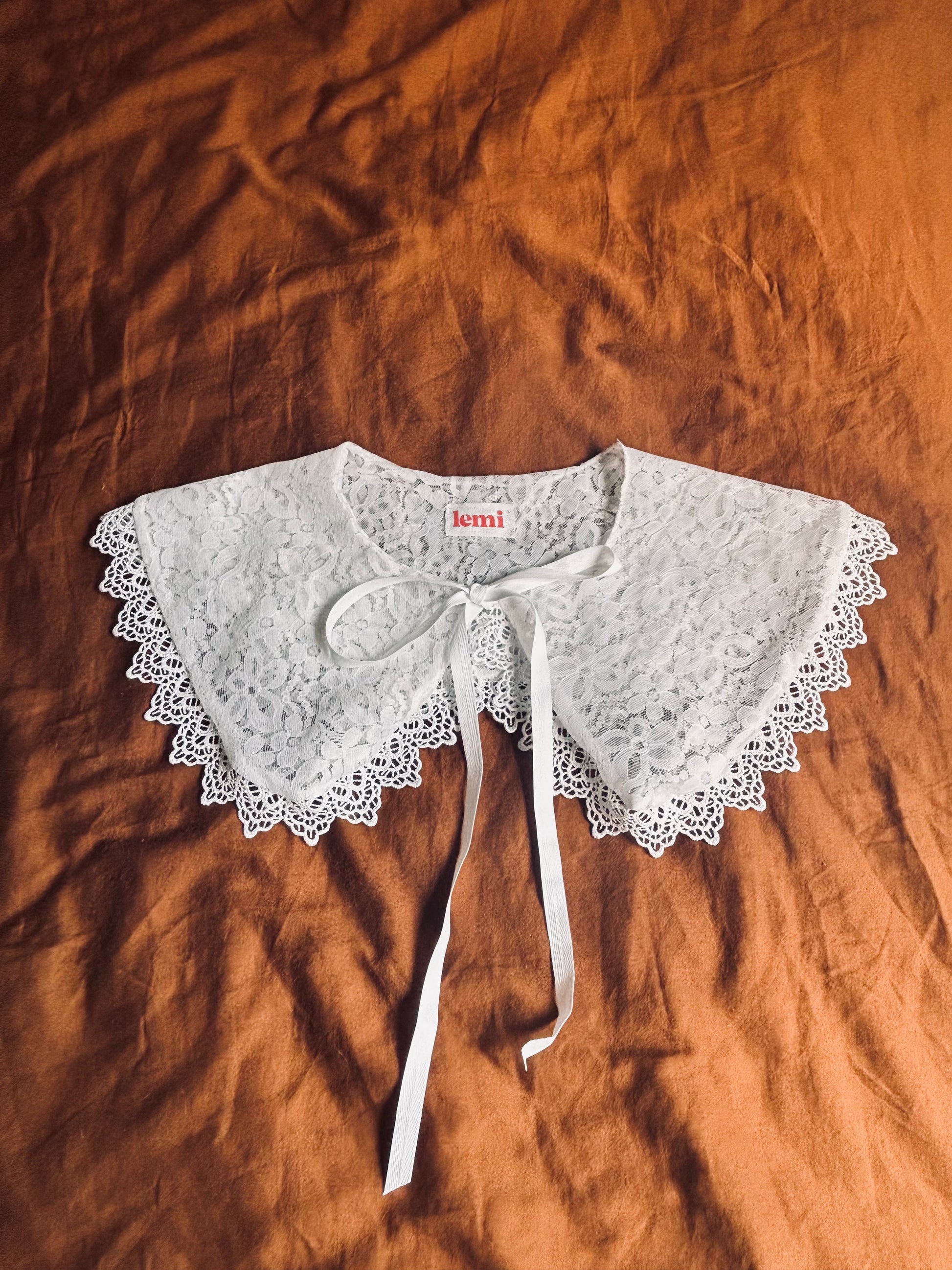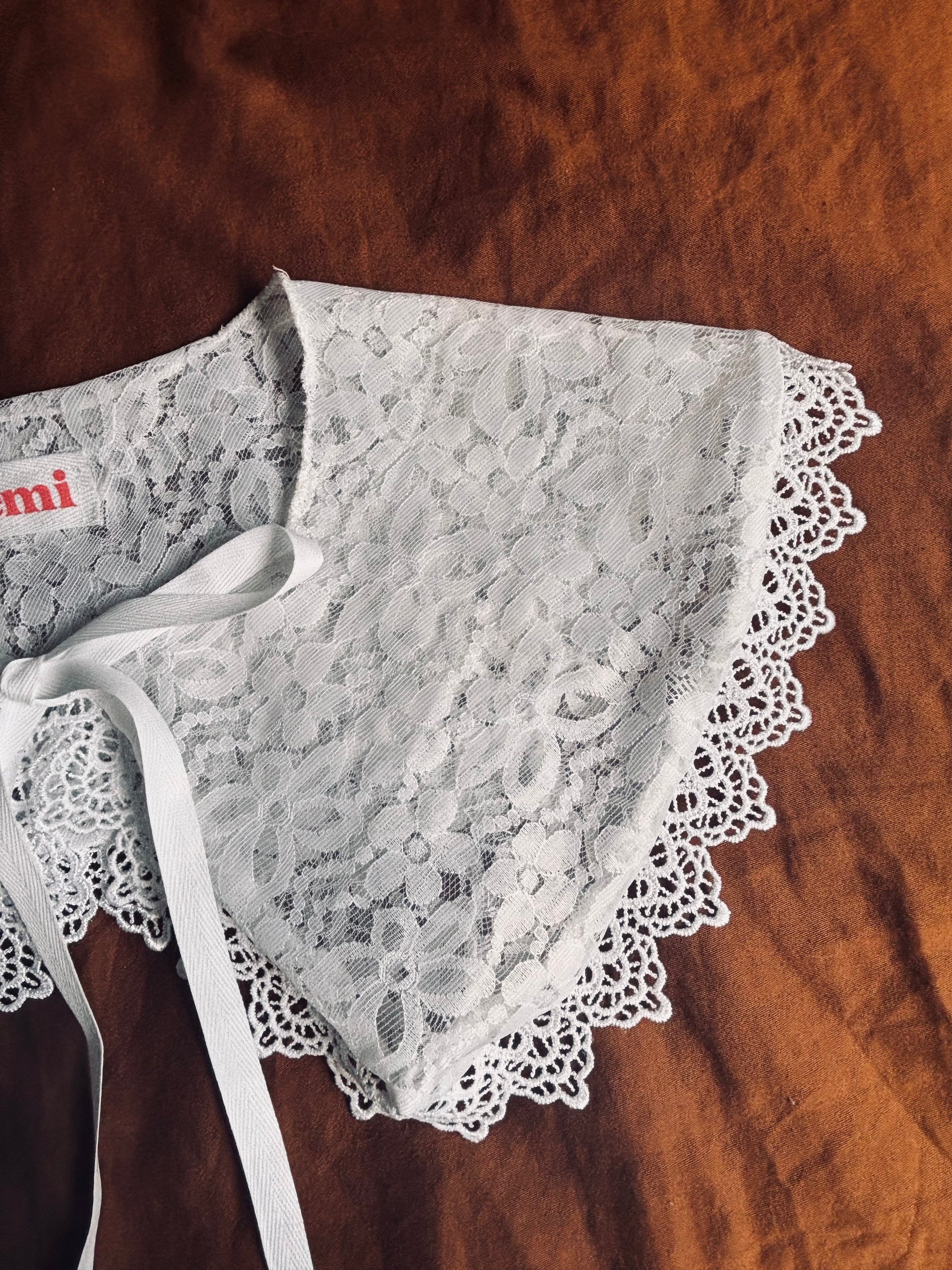 Kołnierzyk jest wspaniały i śliczny- uszyty cały z sukni ślubnej, wykończony koronkową dosyć dużą  tasiemka- który sprawia, że jest dosyć efektowny, słodki i ciekawy,  wiązany na kokardkę.