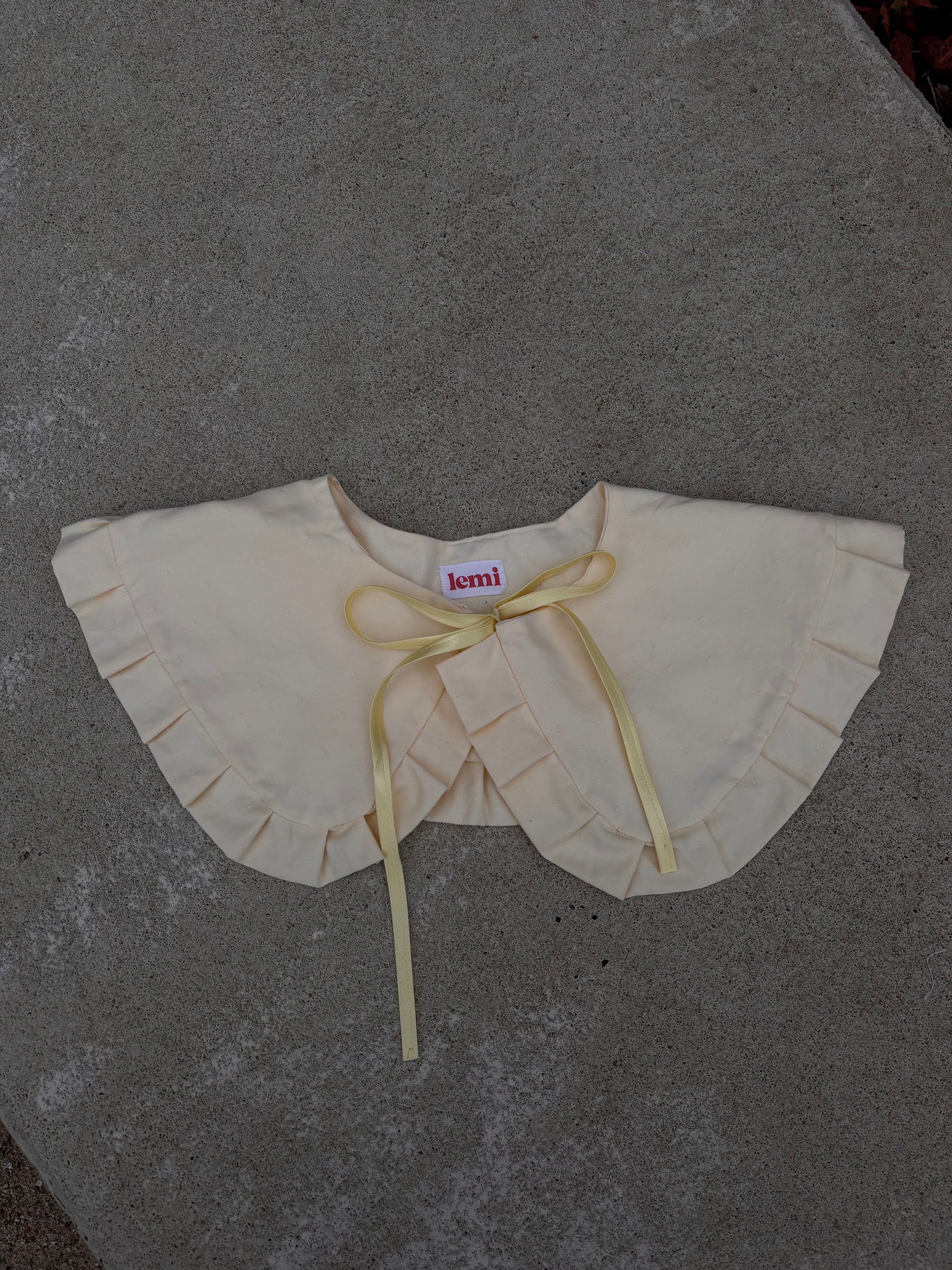 Kołnierzyk masełko powstał z bawełnianego obrusa (wyprodukowanego w Niemczech!) w pięknym masełkowym kolorze w malutkie kwadraciki. Troczki do zawiązywania udało mi się odzyskać z obszycia obrusa. Kołnierzyk jest miękki, ale zachowuje swój kształt, wykończyłam go falbaneczką.