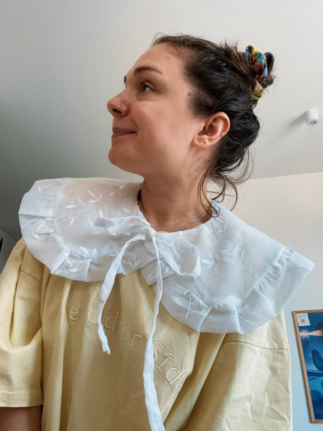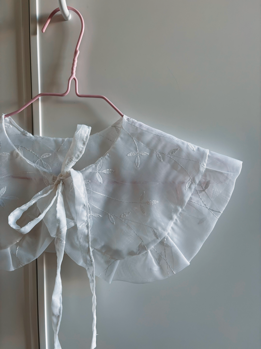 Kołnierzyk powstał z pięknej firaneczki z drugiego obiegu w listkowy wzór, materiał dosyć dobrze trzyma swój kształt jest troszkę transparentny, wiązany na bawełnianą jodełkową tasiemkę, zwiewny i mega cute.