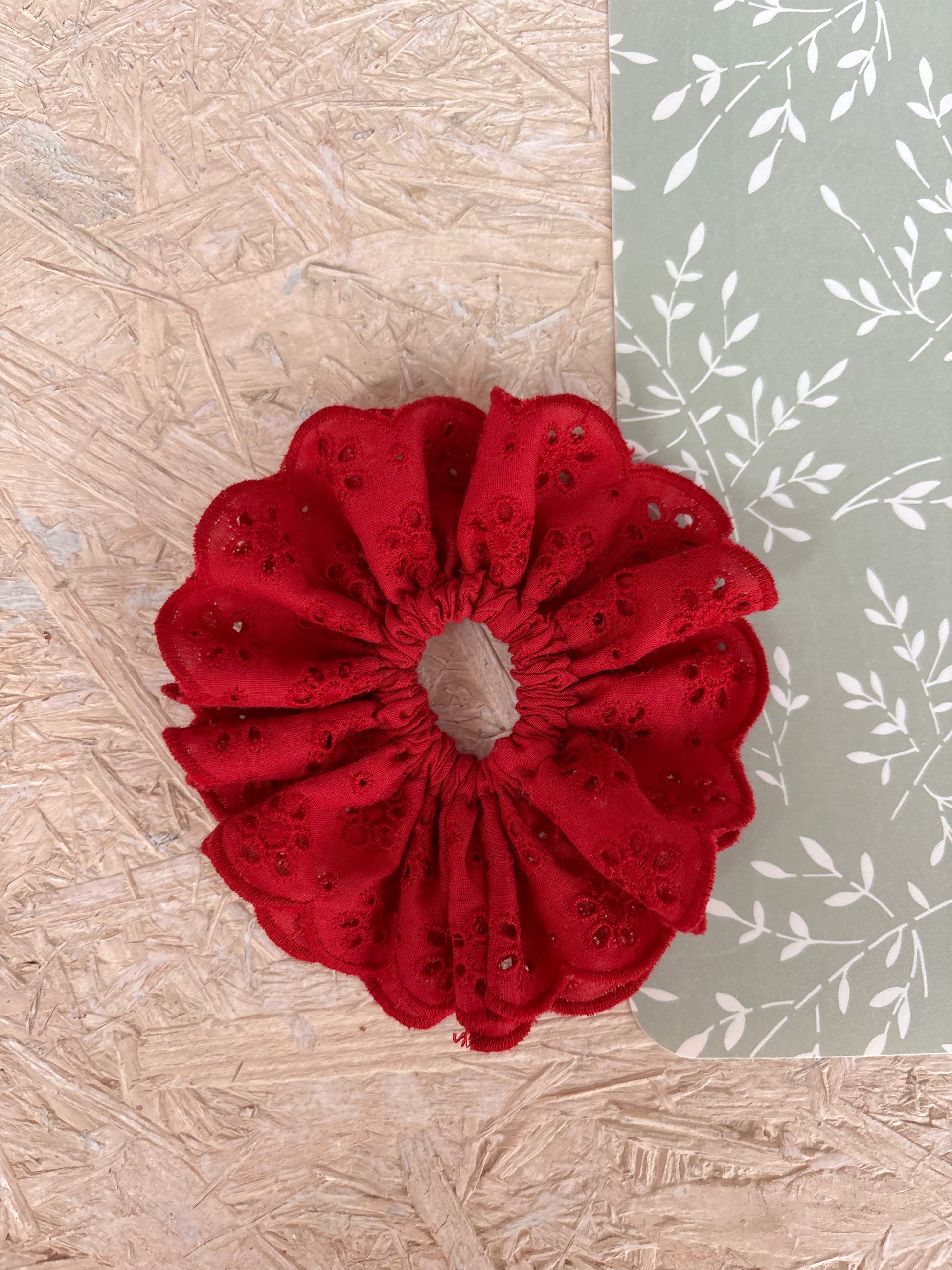 Scrunchie uszyta z bawełny z haftem angielskim.  Gumeczka ma dwie warstwy i jest dosyć ciasna wiec nie trzeba jej owijać dwa razy.  Układa się bardzo ładnie, materiał układa się w dwie oddzielne falbaneczki. Spójrzcie tylko na nią, piękny intensywny jesienny kolor!